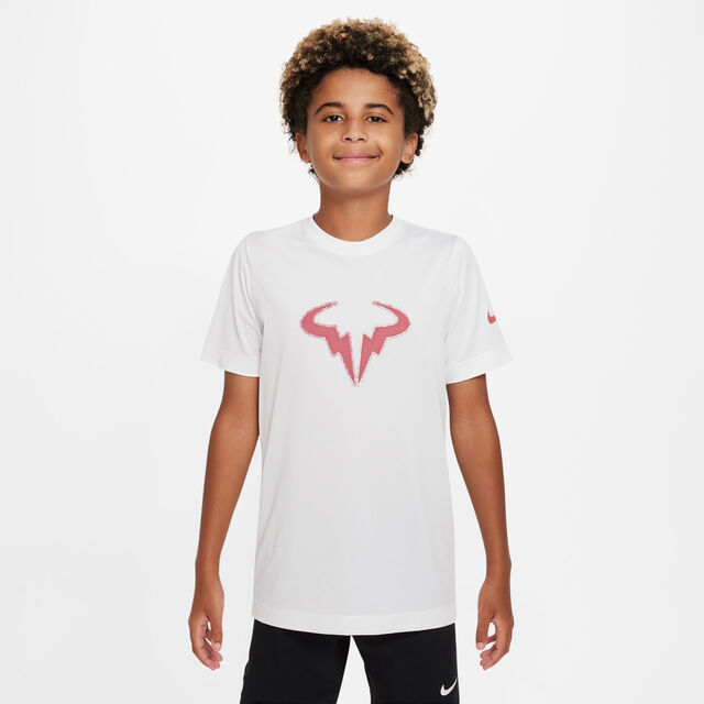 Rafa Trainings-T-Shirt für ältere Kinder (Jungen) Egal, ob du ein Hardcore-Tennisspieler, ein Anfänger oder einfach nur ein großer Rafael Nadal-Fan bist – trag dieses Nike Dri-FIT-T-Shirt auf dem Spielfeld und in der Freizeit. Das Logo zeigt Nadals Spitznamen ""The Raging Bull"" auf einem Material, das Schweiß ableitet. Die Dri-FIT-Technologie hält deine Füße trocken und bequem. Das weiche Strickmaterial ist leicht und atmungsaktiv. Die Passform fühlt sich an wie dein klassisches T-Shirt, das nicht zu locker und nicht zu schmal ist. Der gerippte Kragen dehnt sich, damit du das T-Shirt einfach an- und ausziehen kannst. More Details100 % PolyesterMaschinenwäscheImportiert100% POLYESTER